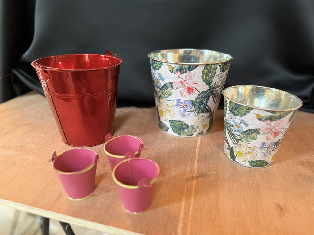 Seaux différentes tailles et couleurs : 43 pièces : 20 petits seaux , hauteur: 6cm, diamètre : 5,5 cm 9 seaux moyens , hauteur : 6,5 cm, diamètre : 6,50 cm 14 seaux moyens /grands , hauteur : 10 cm, diamètre : 10,5 cm 26 pièces : 3 seaux rouges + 5 contenants fleuris( orchidées ) grands + 3 contenants fleuris ( orchidées ) petits + 15 petits seaux fuchsia avec anse .