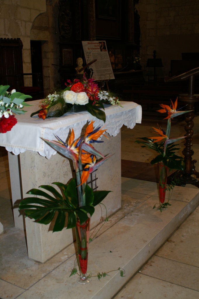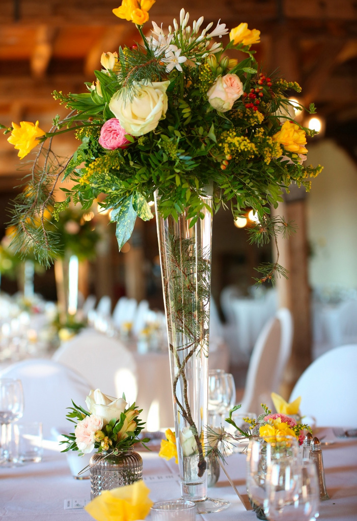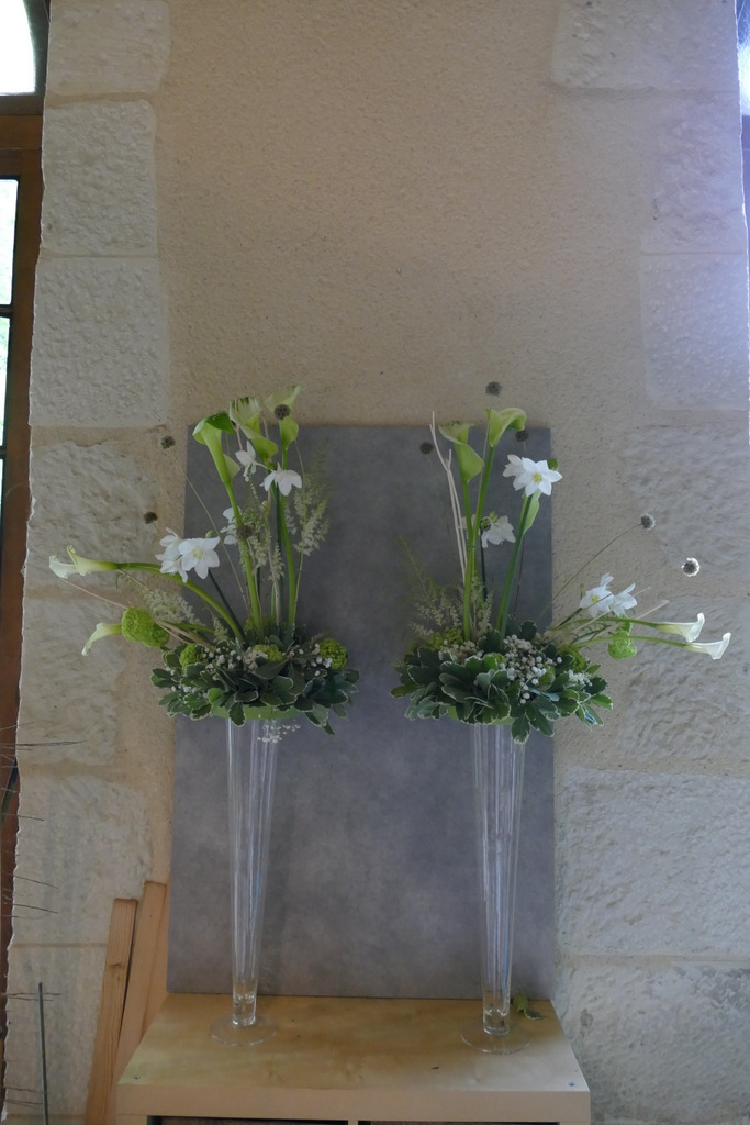 Vases coniques hauts , en verre, hauteur 60 cm, permettant de nombreuses compositions pour centres de table ou décors divers. Très bon état
