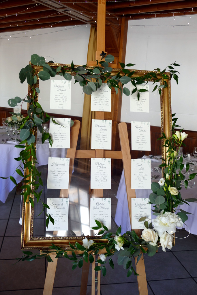 Cadre ancien doré pouvant servir de plan de table. Plaque de plexiglass collée au cadre, permettant de placer les cartes des table.