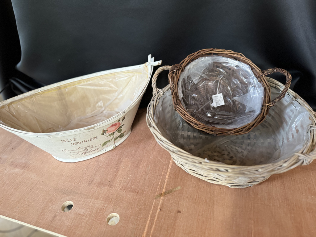 Lot de différentes panières en rotin : 5 panières moyennes marron avec anses 3 grandes panières gris cérusé ( idéal pour pétales de roses à lancer ) 4 panières " Belle jardinière" , pour compositions piquées ou pour lancer des pétales .