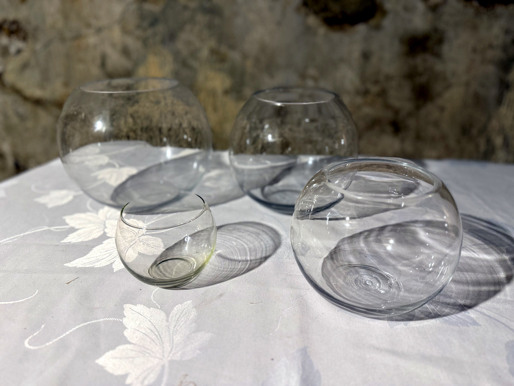 Important lot de 40 vases boule de différentes tailles : 8 vases grands : hauteur : 18,5cm, diamètre : 21 cm 12 vases moyens : hauteur : 17 cm, diamètre : 18 cm 10 vases petits : hauteur : 13,5 cm, diamètre : 15,5 cm 10 vases mini : hauteur : 8,5 cm, diamètre : 9,5 cm Très bon état