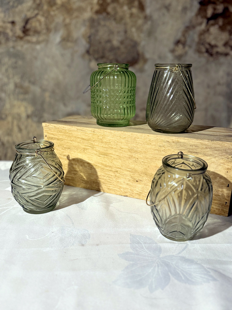 Petits vases ovales gris fumé et vert clair, avec anses dorées. 4 motifs assortis Attention : 15 vases retenus temporairement . Vérifiez état du stock