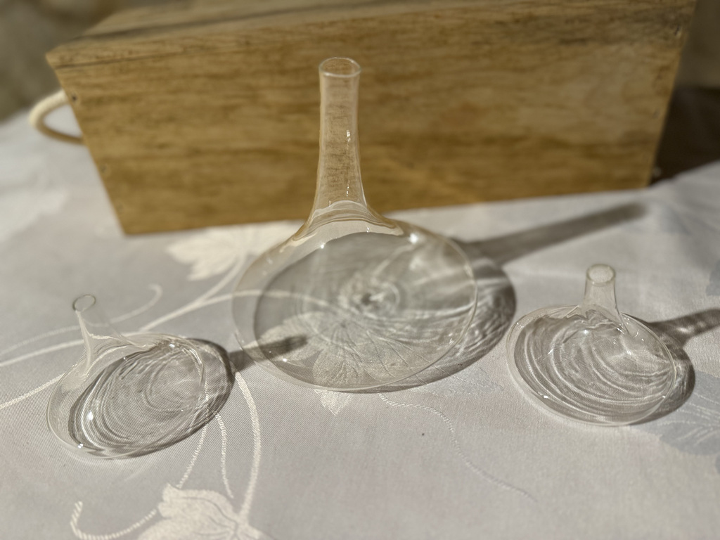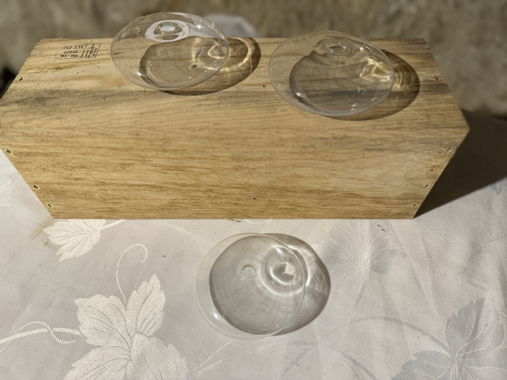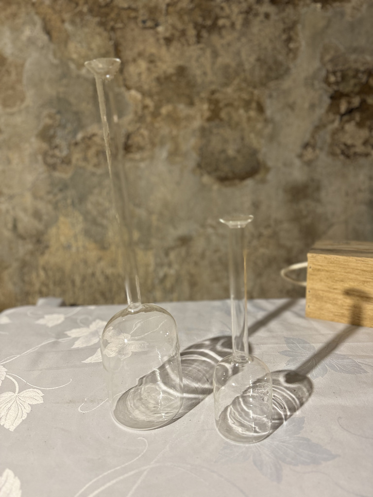 Lot de soliflores de forme très originale . En centre de table, travailler soit par 1 grande fiole, soit par 3, 1 grande fiole et 2 petites. 6 grandes fioles : hauteur : 13,5 cm, diamètre : 13,5 cm prix unitaire : 5 €, prix du lot : 20 € 12 petites fioles : hauteur : 7 cm, diamètre : 7 cm prix unitaire : 3 €, prix du lot : 30 € Lot global : 40 €