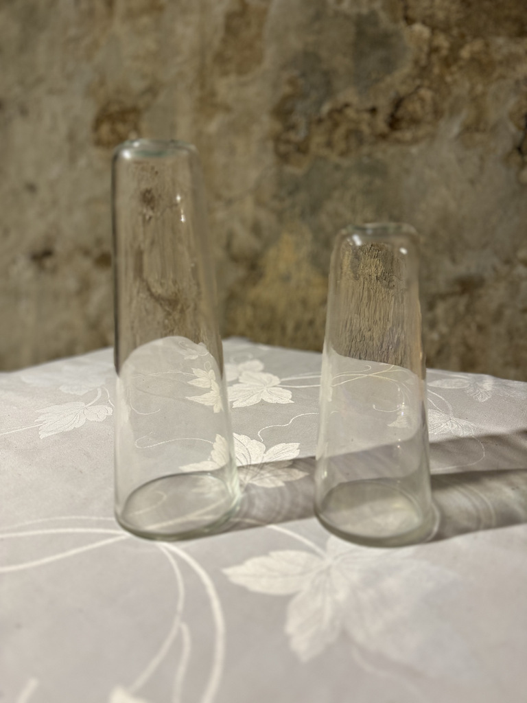 Soliflores de forme conique très moderne, mais qui s'harmonise bien avec des ambiances vintage . 2 dimensions : 5 soliflores grands , hauteur : 23 cm, base : 8 cm, diamètre haut : 5 cm 9 soliflores moyens ( sur 19) , hauteur : 18 cm, base : 7 cm, diamètre 4,5 cm 10 soliflores moyens déjà retenus