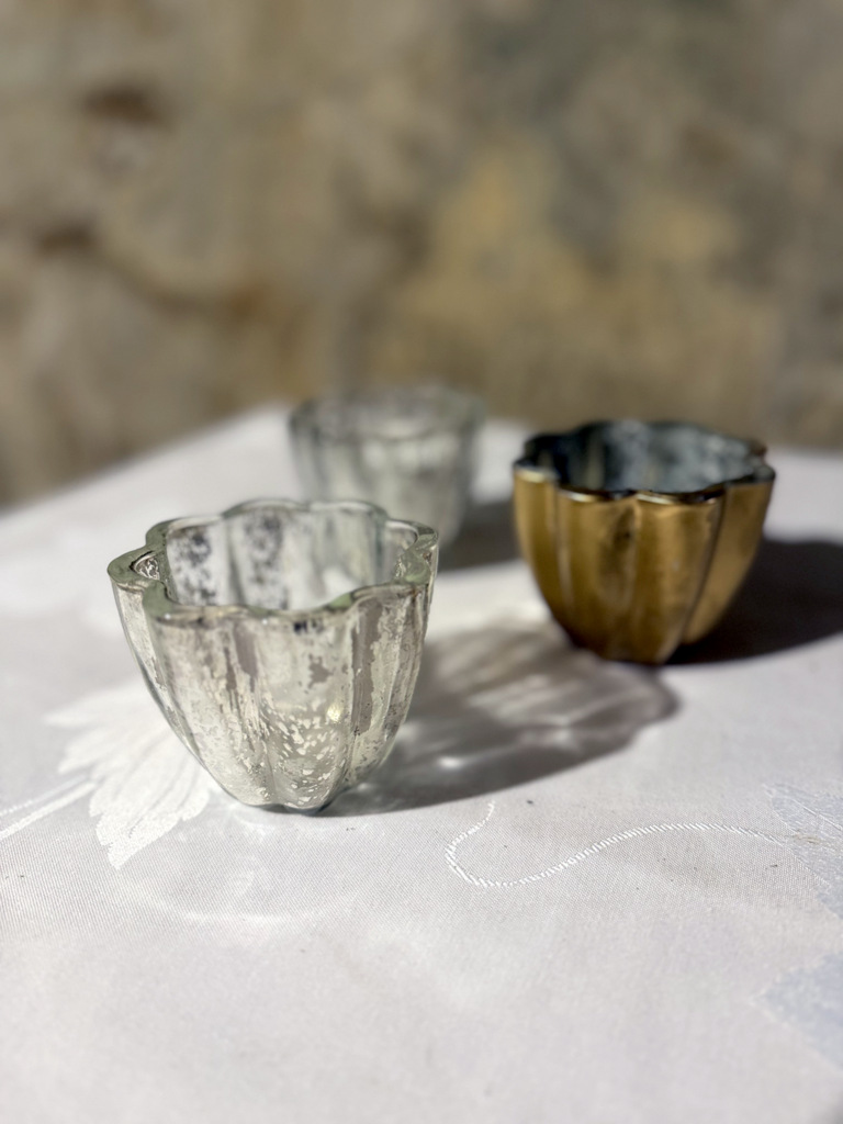 Lot de 28 photophores " fleurs", 3 coloris: dorés, mercerisé, gris clair Bien stables, beaucoup de succès sur les tables de mariage